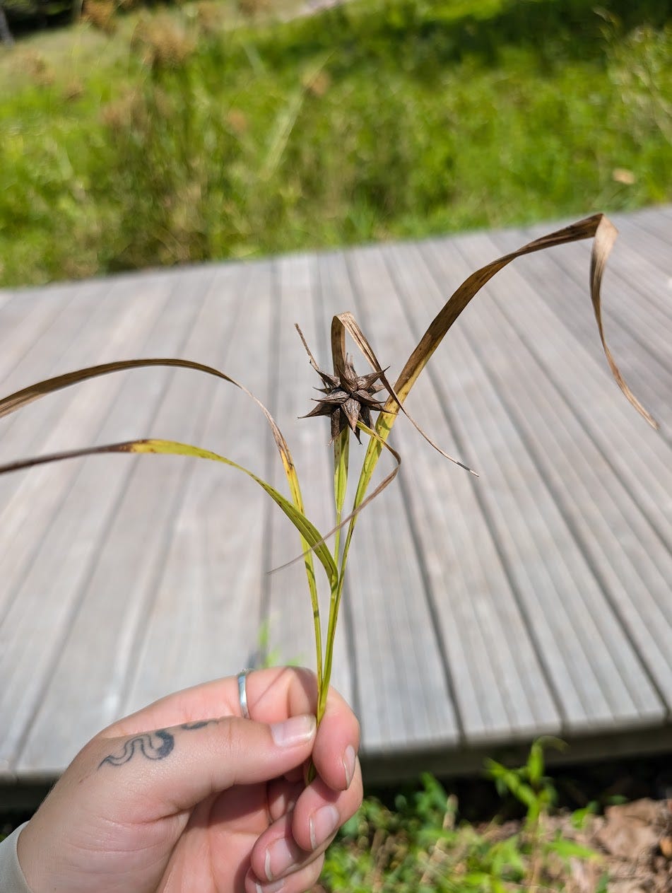 Mace Sedge is the only sedge I have included in this sampler, but I hope it's a memorable one! Sedges and grasses are often similar looking, but sedges can be differentiated by the triangular leaf base (or "sedges have edges"). The seedpods of Carex grayi form a mace-like head that some Pokemon Go fans might recognize as similar to the pokemon Xurkitree (shoutout to Mandy Monson for this comparison!). Mace Sedge has no known combat abilitites, but it is a native plant that does well in wet conditions like swamps and riverbeds.