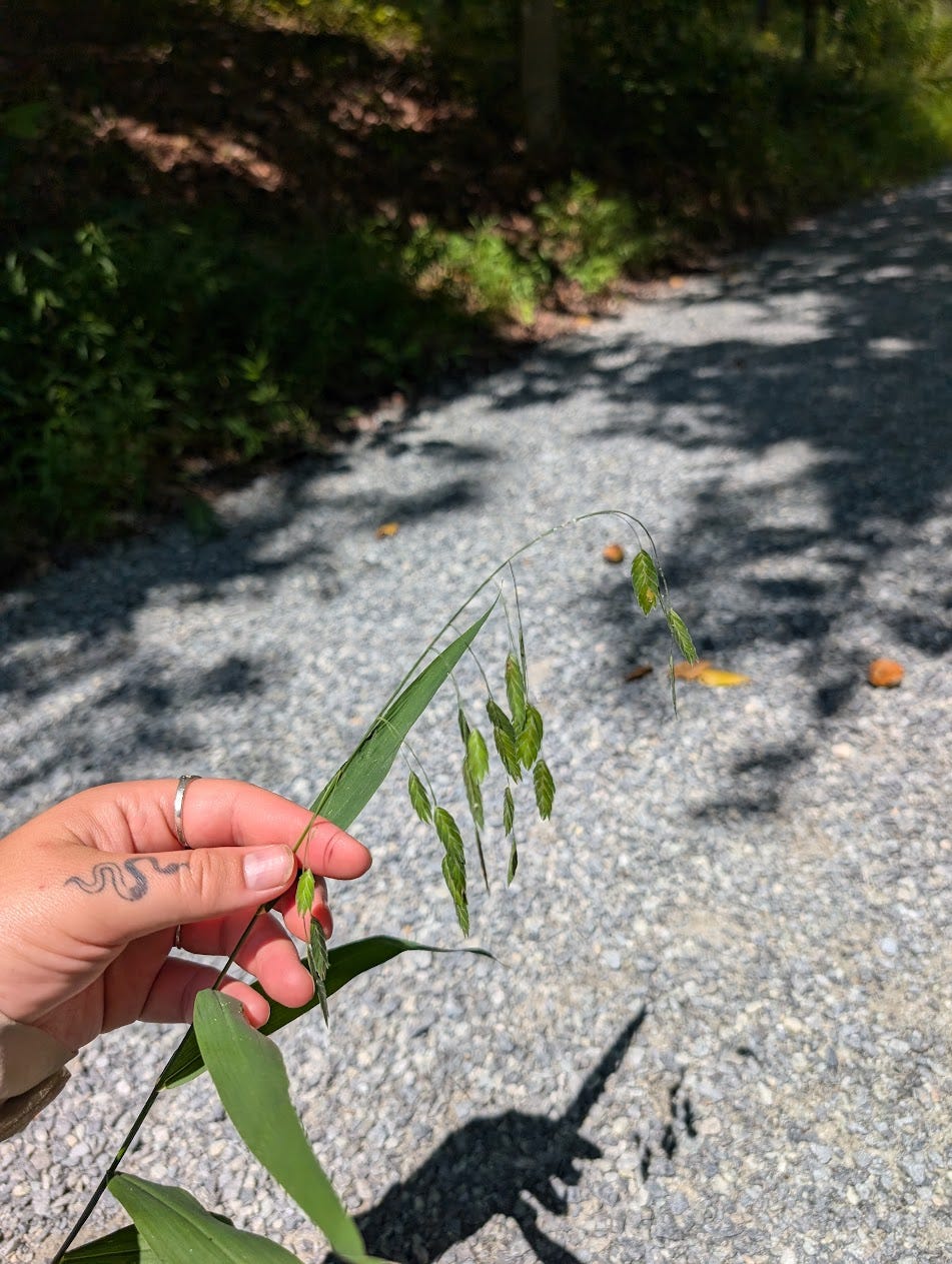 There are many grasses and sedges to appreciate beyond the meadow as well! Along the woodland trail, lookout for River Oats or Chasmanthium latifolium. The genus is derived from the Greek "chasma" meaning yawn or wide opening (think chasm) and "anthium" meaning flower, referring to the wide and flat arrangement of the seedheads of grasses in this genus, the species name "latifolium" is used in other Latin names and means "broadleaved." As the common name suggests, these plants are often found near flowing bodies of freshwater.